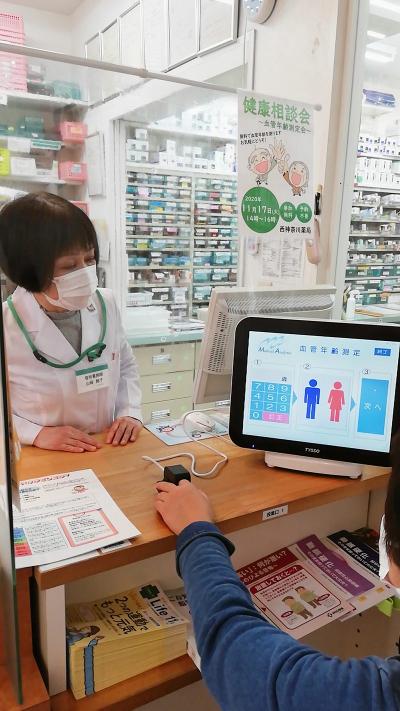 【参加者の様子】年齢層は50代以上の方でしたが、機器の操作も簡単で結果も短時間に出るので、とても好評でした。メーカーからの動脈硬化や生活習慣、食生活に関するパンフレットも多く用意し、参加者が自分にあったものを持ち帰られました。希望された方には血管点数の評価、血管年齢に影響する因子などのお話もいたしました。