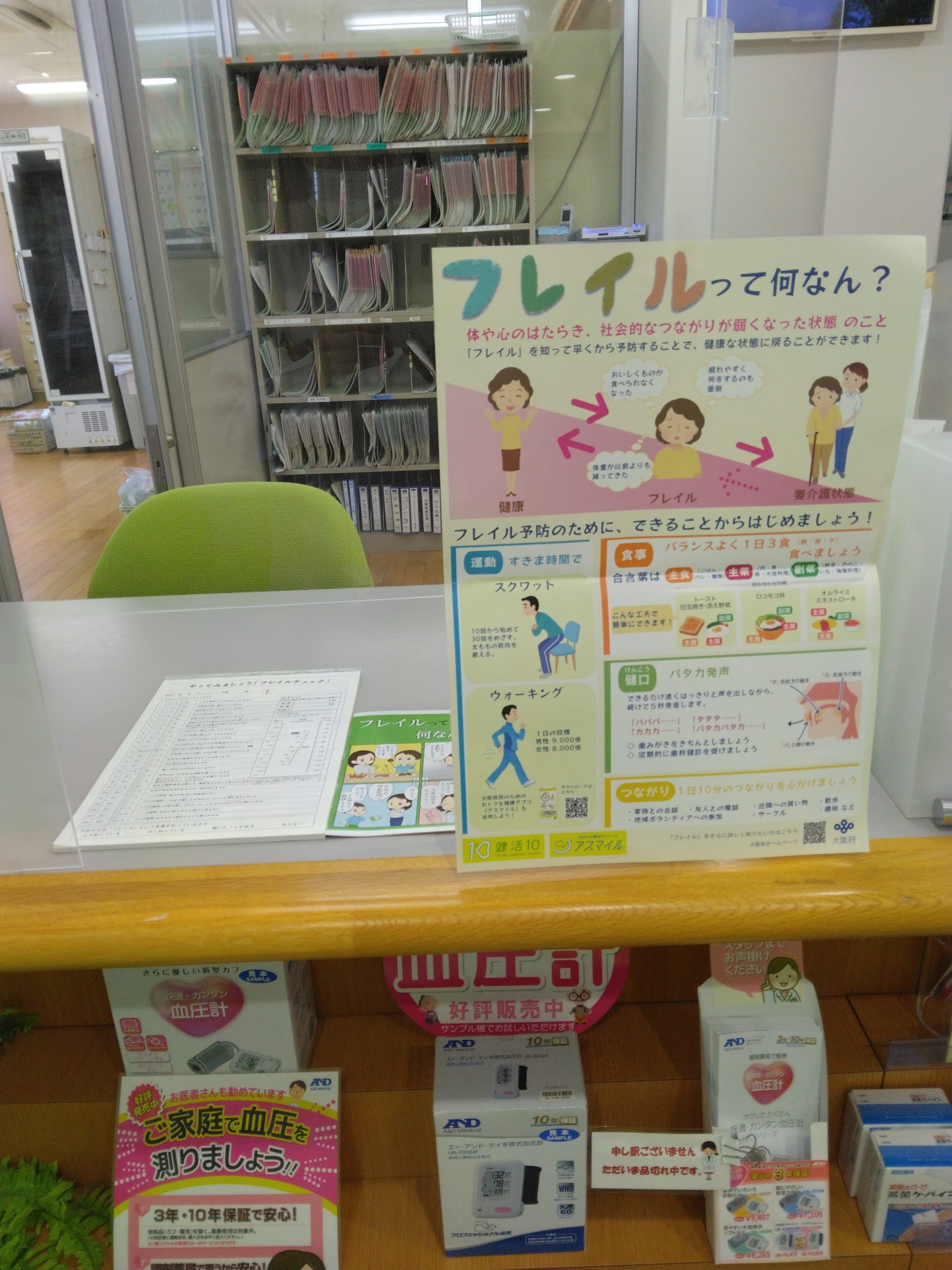 当店に来局者の中で、主に40~50歳代を対象に複写式質問紙(フレイルチェック)やポスターを用いて実態把握と啓発を行いました。