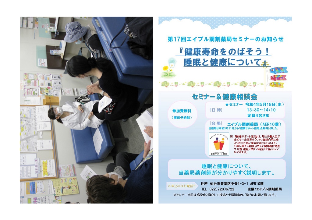 - 第17回エイブル調剤薬局セミナー&健康相談会「健康寿命をのばそう!睡眠と健康について」を実施致しましたので報告いたします。