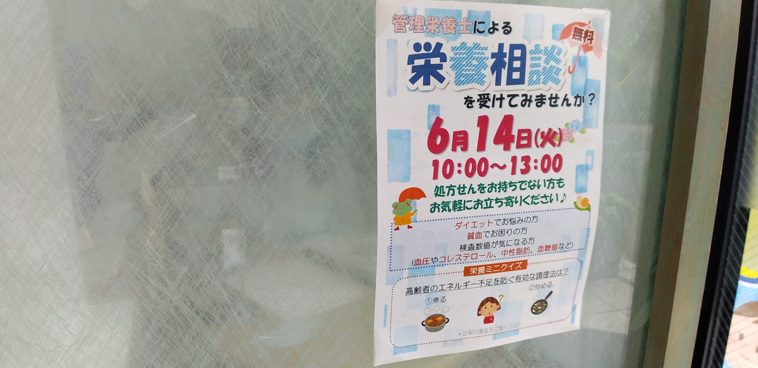 令和4年6月14日センター北駅前つばさ薬局で管理栄養士と連携し「健康・栄養相談会」を行い9名の方の相談にお答えしました。