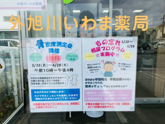 地域の方の健康維持を目的として外旭川いわま薬局では2022年3月28日(月)から4月28日(木)の期間に「骨密度測定会」と「物忘れ相談会」を同時開催しました。