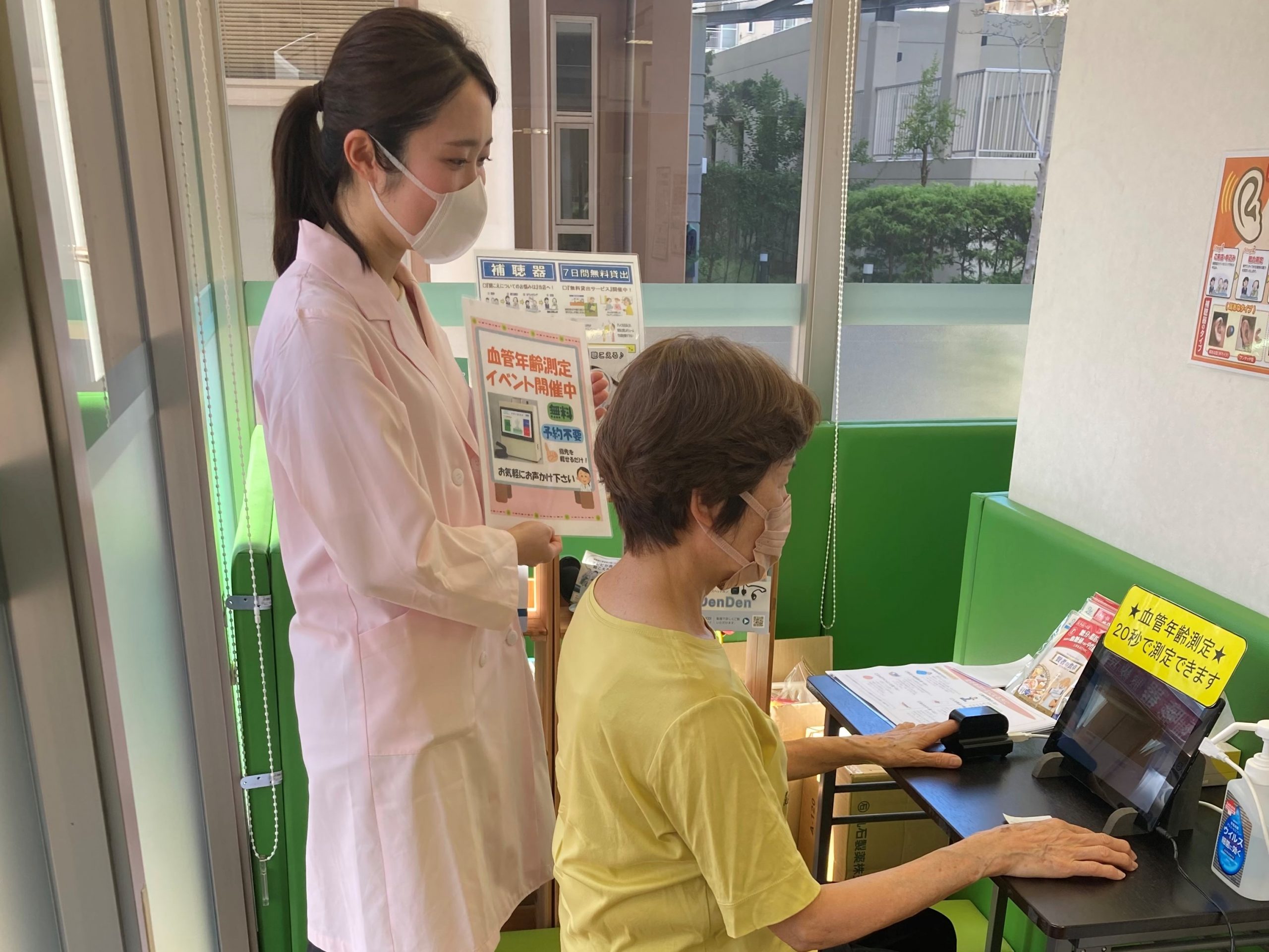 2022年10月4日(火)日本調剤 ベイタウン薬局(千葉県千葉市)では、地域住民の皆さまの健康意識の促進を図ることを目的として、血管年齢測定イベントを開催いたしました。今回、薬局店内で行われた本イベントは、新型コロナウイルス感染予防のため、来局された方に対しマスクの着用や手指消毒のお願い、使用ごとの測定機器の消毒など、できる限りの対策を講じて開催いたしました。