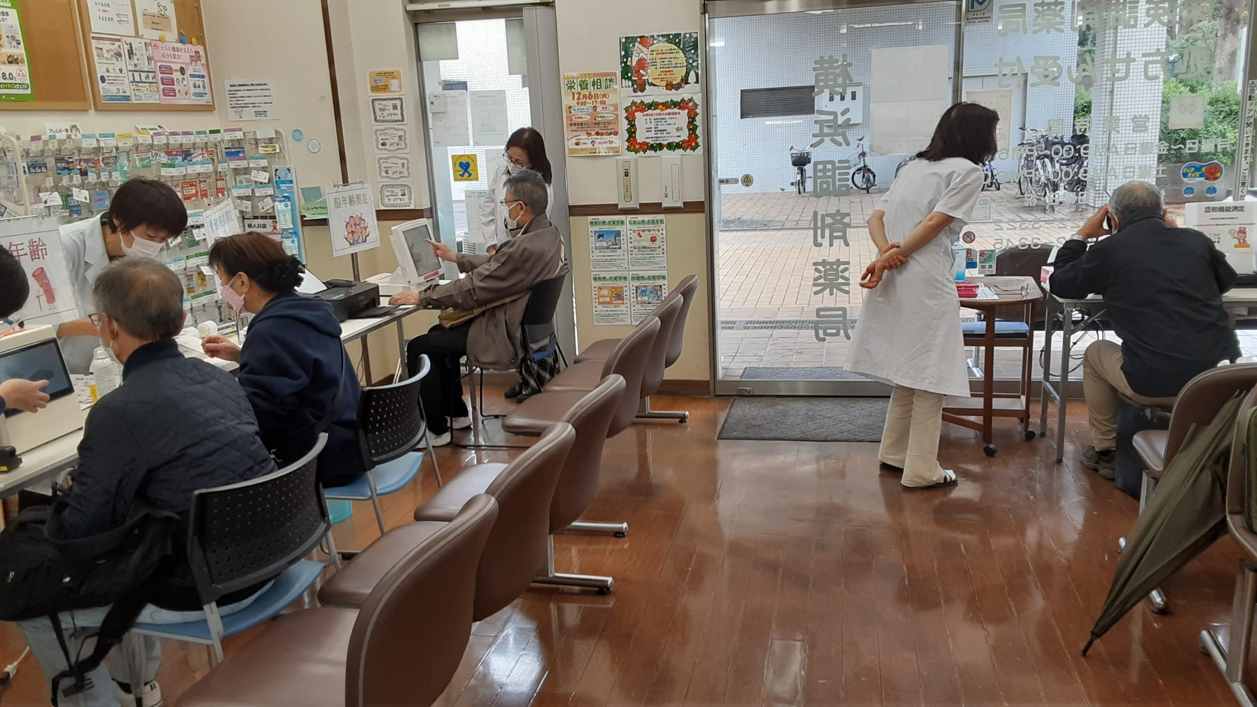 健康フェアを行いました。血管年齢、骨年齢、脳年齢、美肌年齢、認知機能測定、握力測定を行ない、お薬お待ちの方や地域の方にご利用頂きました。結果を見ながら普段のお食事の事などアドバイスしながら楽しく地域活動が出来ました。