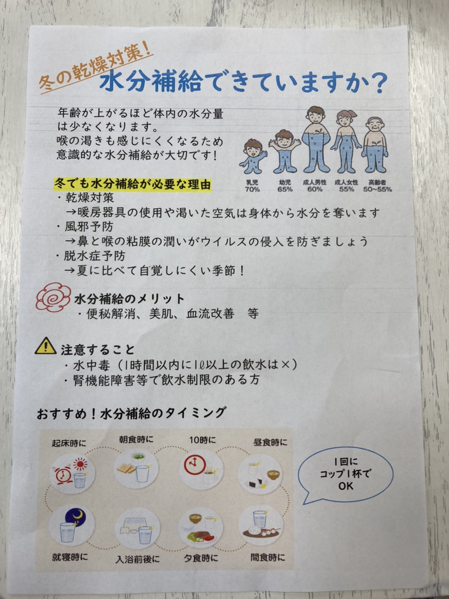 概要:冬は夏と比較して飲水量が低下します。また、マスクを着けていることで喉の渇きを実感しずらい状況です。そこで今回は水分補給の大切さやおすすめの補給タイミングをまとめたポップを作成し、配布。同時に水分補給を意識していただけるようにお声がけを行いました。