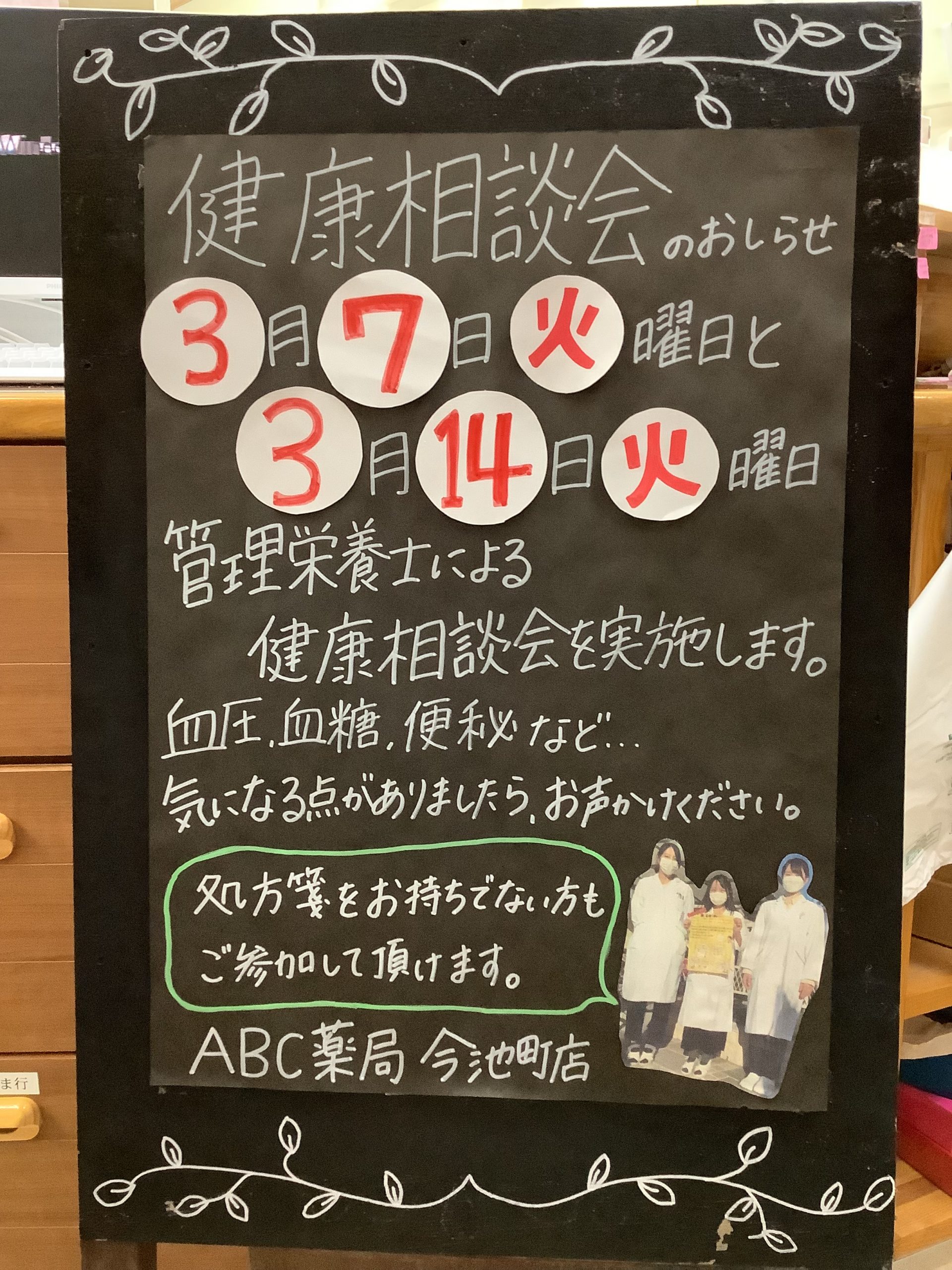 ABC薬局今池町店では、地域の皆様の健康増進のお役に立てればと思い、3月7日と3月14日に管理栄養士による健康相談会を開催しました。