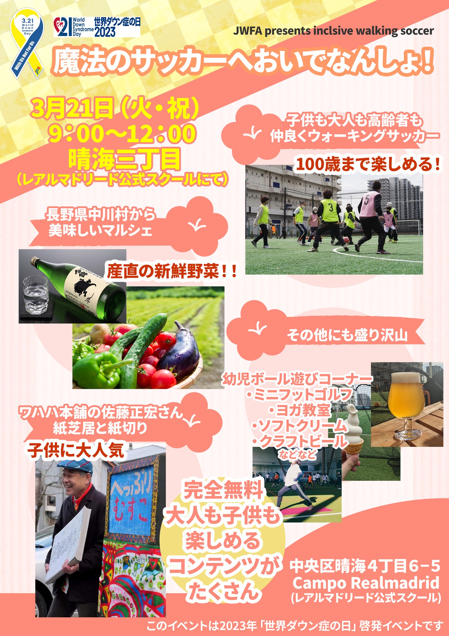 2023年3月21日は、世界ダウン症の日 世界中でダウン症について啓発の催しが開催され、ダウン症、障がいについてみんなで考えようと発信されます。JWFA日本ウォーキングサッカー協会では、昨年から3月21日、世界ダウン症の日に、ダイバーシテイ&インクルージョンの象徴として、ウオーキングサッカーという、性別、世代、障がい、国も超えて、誰もが繋がれる、ユニバーサルデザイン、幸せの運動習慣、歩くサッカーを実施、2023年の今年は、東京都中央区晴海のレアルマドリードファンデーションジャパンの綺麗な施設を使用して、歩くサッカーだけでなく、ヨガや紙芝居、紙切り、信州のマルシェなど、誰もが楽しめる多彩な内容で、インクルージョンを理解しようと、感動のイベントを企画!子供から高齢者、ご家族まで、大勢の参加者で盛大に開催が出来ました。