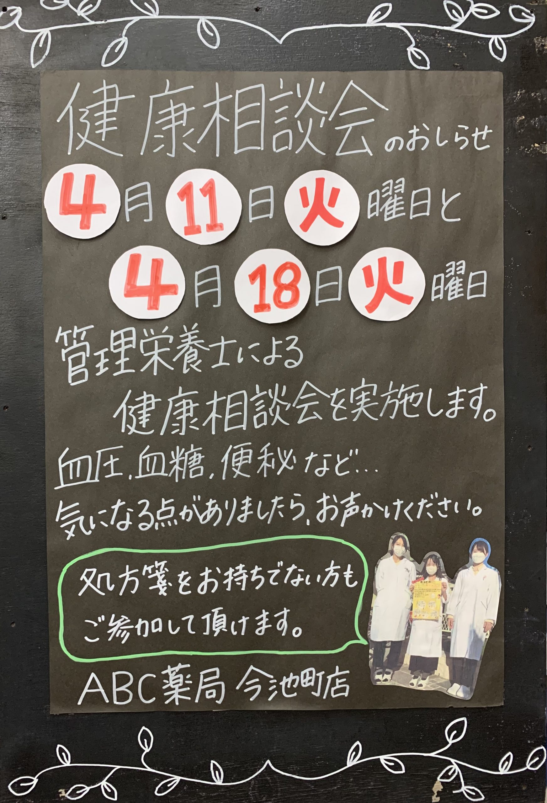ABC薬局今池町店では、地域の皆様の健康増進のお役に立てればと思い、定期的に管理栄養士による健康相談会を開催しています。今回は4月11日と18日に開催しました。