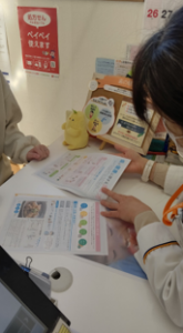 今回は「お口の成長と食べ方」や「バランスの良い食生活」についてまとめた資料と三重県歯科医師会作成の「歯と口の健康情報」を配布しました。
