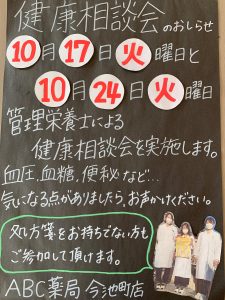 ABC薬局今池町店では、地域の皆様を対象に10月17日と24日に管理栄養士による健康相談会を開催しました。
