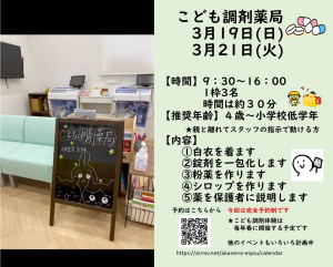 開催概要:こども調剤体験会を実施。分包機2台を使って散剤分包と錠剤一包化、シロップ薬の計量、投薬体験を行い、修了書の配布を行いました。薬局薬剤師の業務体験を通じて、薬について関心を持ち、適正使用について学習しました。