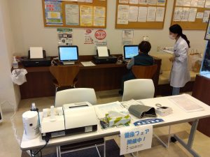 測定会として血圧計、骨健康度、脳・血管年齢の測定できる機械を用意し結果に基づいた栄養相談を行いました。
