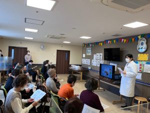免疫力とは何か?免疫力をアップさせるためにはどうすればよいか?など、適度な運動やお食事の内容についてお話させていただきました。栄養素に関するクイズを実施したり、椅子を用いたスクワットをしたりと、地域の方の交流の場にもなったのではないかと思います。