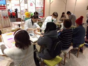 北千住マルイのイベントスペースにて、健康機器(骨健康度測定器、肌年齢測定器、らくらくウェルネス、体組成計)を持ち込み、参加者の方に測定していただき、その結果に基づき栄養指導・健康相談を実施した。