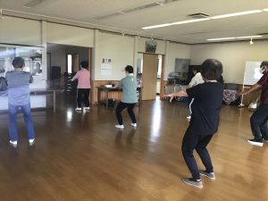 入門、初級をやったあと、扇の動きをしました。久しぶりの方は扇がなかなか開かなかったり、閉じなかったりしましたが、笑顔いっぱい楽しんで行うことができました。