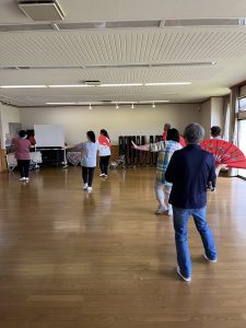 扇では「開くのに気をつかうから、足も左手も何をやっているか分からないな」と皆さん笑いながら話されていましたが、「まずは扇を片手で開いて片手で閉じる練習しましょう。足と左手はそのあとですね」と先生は話されていました。