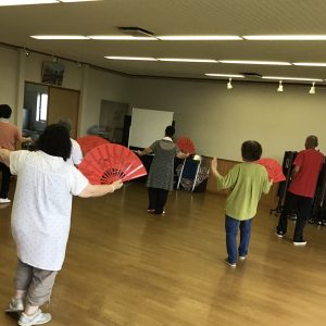 入門編はスムーズにできるようになってきたので、今日は扇を使った動きを念入りに練習しました。扇では一人ずつみんなの動きを客観的に見て、扇がどのように見えているのか確認しました。扇が揃って開くと、とてもきれいに見えて華やかになりました。