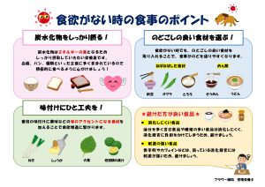 今回は「食欲がない時の食事のポイント」について講演しました。暑い時期は水分補給が大切になりますが、食欲がでないこともあります。その時におすすめの食品やレシピの紹介を行いました。