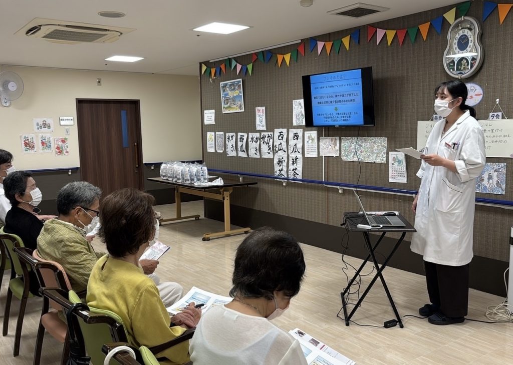 「健康寿命のカギはフレイル予防」というテーマで実施し、フレイルとは何か、なぜ対策が必要かなど、食事と運動の話を中心にお話しました。またクイズや簡単にできる筋力アップトレーニングを行い、みなさんに積極的に参加していただけて良かったと思います。