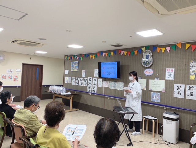 フレイル予防のための食事や運動、社会参加について、クイズを交えてお伝えしました。メモを取りながら聞いていただけたり、質疑応答の時間ではたくさんの質問をしていただけたりと、参加者様にとって良い情報提供ができたのではないかと思います。