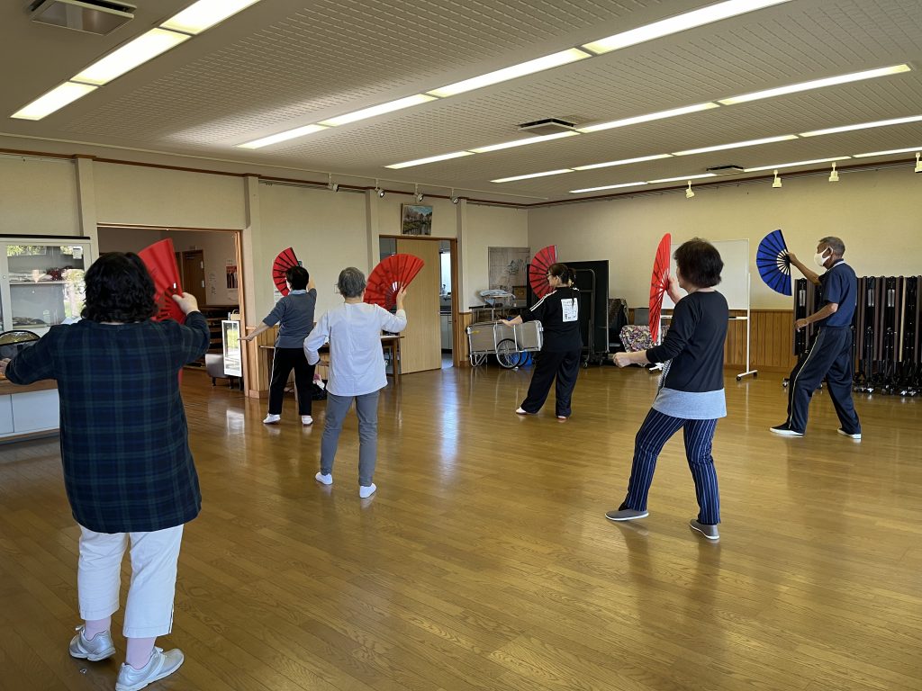 その後一歩進めた扇の動きを先生に見せてもらいながら見様見真似で行いましたが、やはり初めてなので足の動きが分からなくなり「気づいたら足の方向逆になっていた」「手と足と両方バラバラに動かさなきゃならないから今後がんばらないと」と皆さんお話しされていました。扇を片手で開くのと閉じるのが皆さんとてもお上手でした。