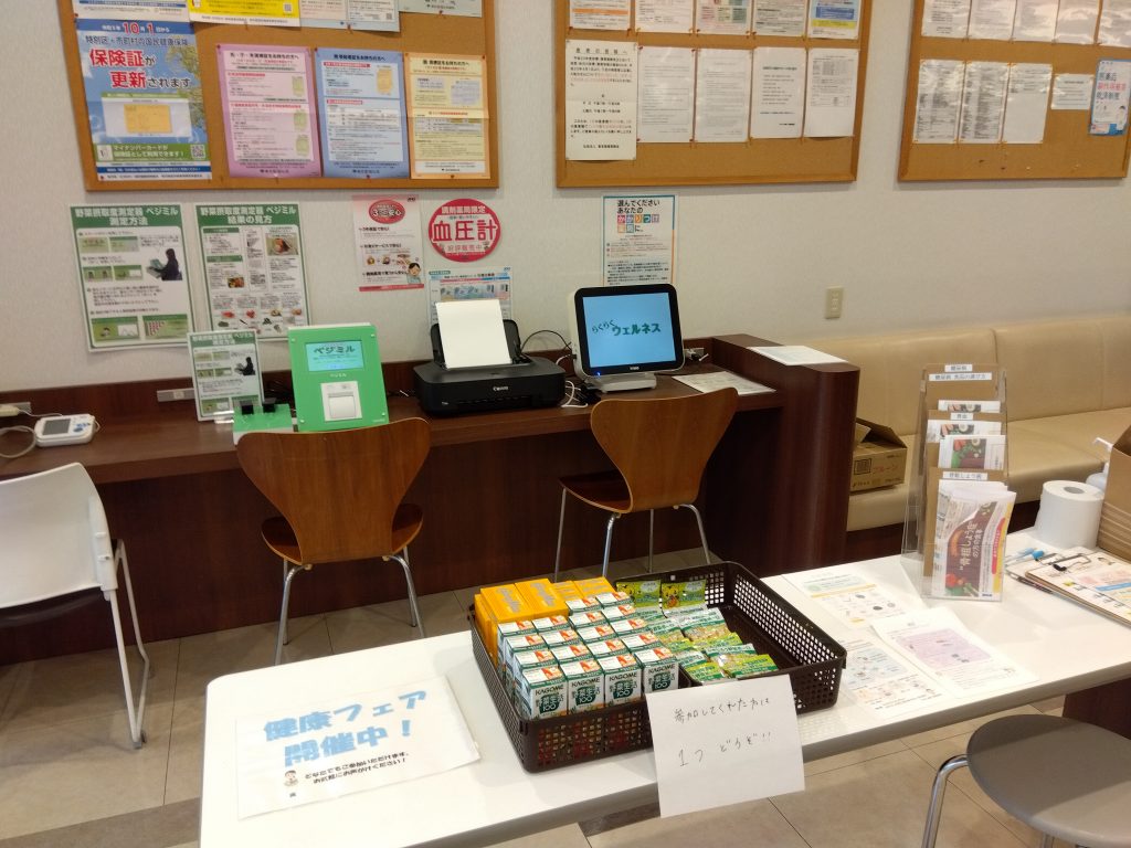 当日は血管年齢、脳年齢、血圧、野菜摂取度の測定器を設置し、参加人数は28名でした。