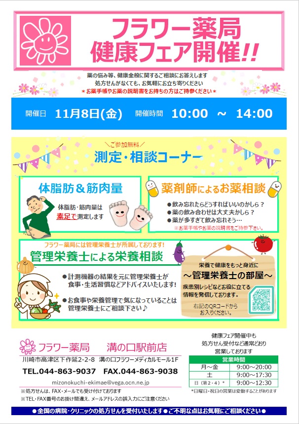 令和6年11月8日、フラワー薬局溝の口駅前店にて「健康フェア」を開催いたしました。