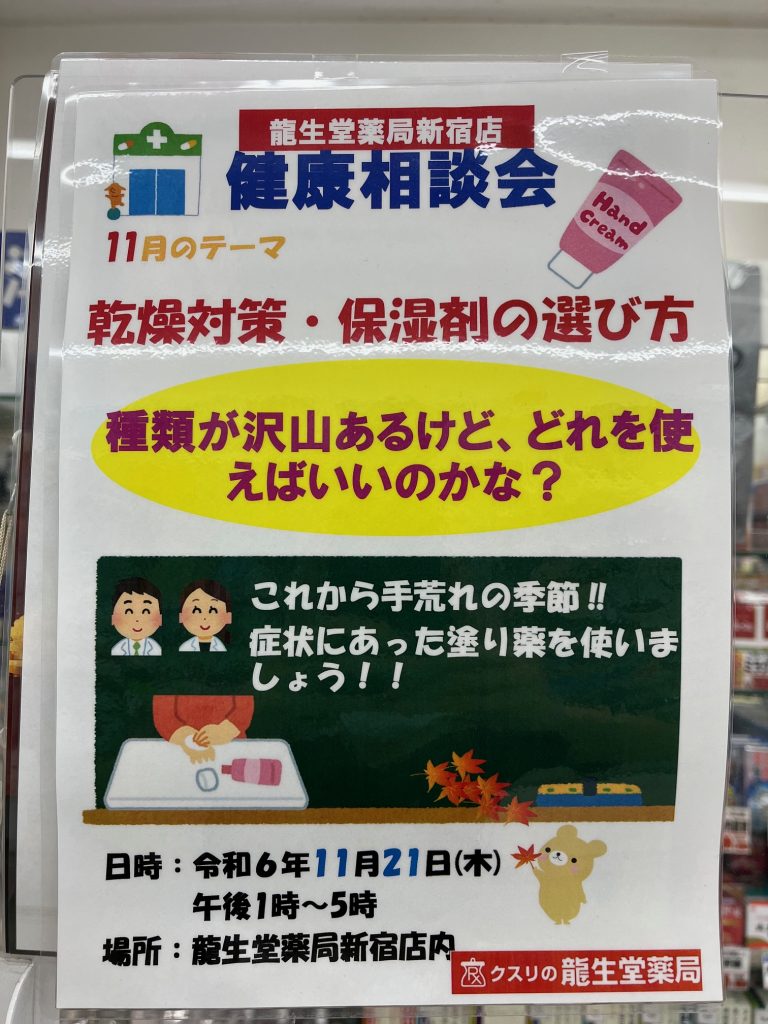 今回、龍生堂薬局新宿店では、乾燥する季節になったため、保湿剤の選び方や使い方をアドバイスし、地域住民の方の肌ケアをサポートしました。