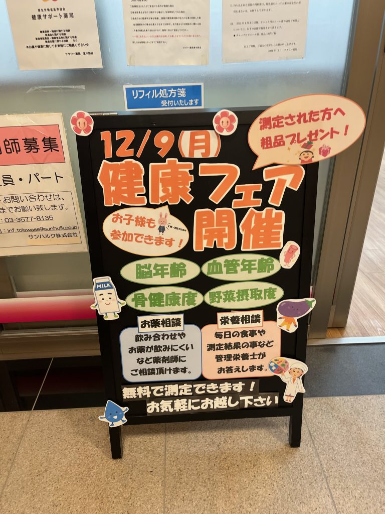 12/9(月)11:00~18:00フラワー薬局東中野店で薬剤師・栄養士による健康フェアを開催しました。