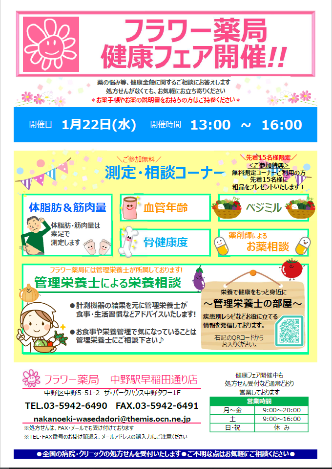 - 【サンハルク株式会社】フラワー薬局中野駅早稲田通り店 「健康フェア」を開催しました。